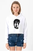 Erased Anime Black White Silhoette Beyaz Optik Kadın Crop KapşonluBeden