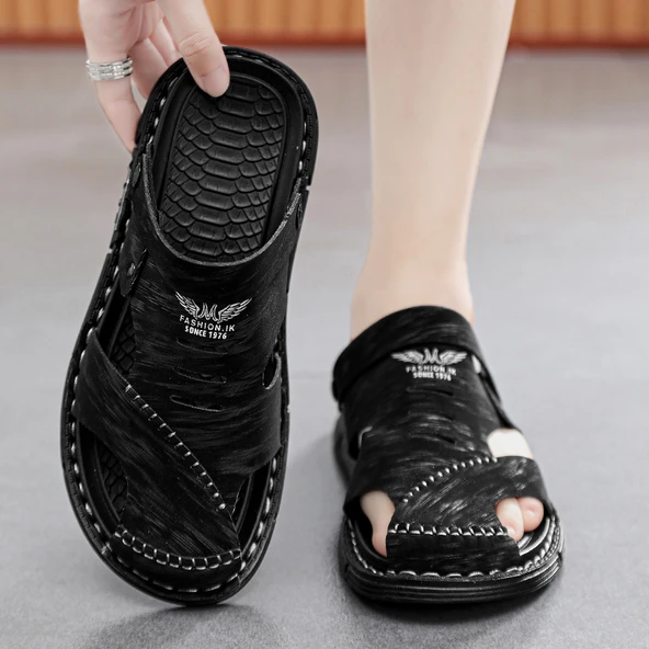 Erkek El Yapımı Deri Dikişli Plaj Sandalet Terlik (Siyah)