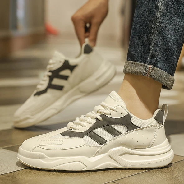 Erkek Günlük Spor Ayakkabı - Bağcıklı - Düz Taban (Bej - Gri)