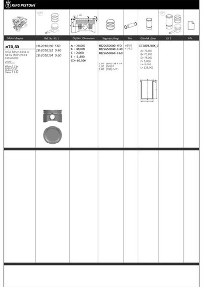 KING PISTON markası Fiat Piston + Segman 70.8mm +0.60mm ( Riken Segmanlı ) Albea 1.2 8v*palıo 1.2 8v*doblo 1.2 8v*siena 1.2 8 - Kingpiston 18-2010194 (KINGPISTON 18-2010194 kodlu) 5893652 GOETZE 877070404000BG OEM kodlarına sahip FIAT araçları için uyumlu olan bu ürün parcayuvasi.com'da uygun fiyatlarla, hızlı ve güvenli kargo ile hizmetinizdedir.