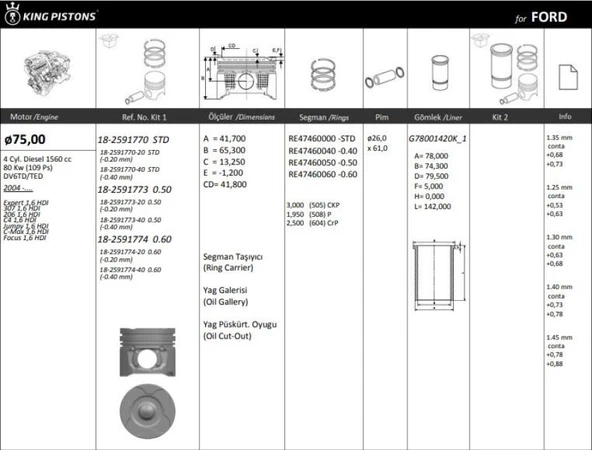 KING PISTON markası Ford Motor Piston+segmanı ( Riken ) 75,00+stdmm Cap Expert 1,6 Hdi 307 1,6 Hdi 206 1,6 Hdi C4 1,6 Hdi Ju - Kingpiston 18-2591770 (KINGPISTON 18-2591770 kodlu) 87-71783 GOETZE 8771783060200G OEM kodlarına sahip FORD araçları için uyumlu olan bu ürün parcayuvasi.com'da uygun fiyatlarla, hızlı ve güvenli kargo ile hizmetinizdedir.