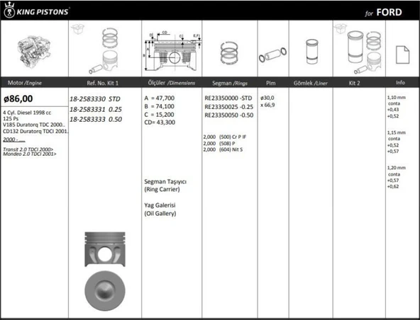 Ford Motor Piston+segmanı ( Riken ) 86,00+stdmm Cap Transıt 2.0 Tdci 2000> Mondeo 2.0 Tdci 2001> V185 Du - Kingpiston 18-2583330