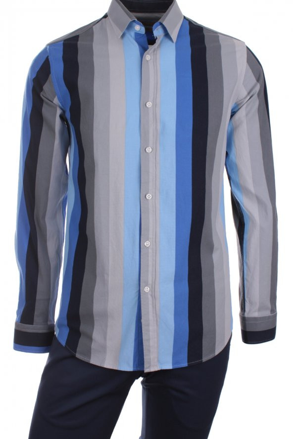 Gökkuşağı Kalınçizgi Renkli Mavi LC1026 Pamuk Spor Erkek Gömlek