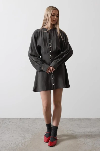 Gold Rengi Düğme Detaylı Elbise - Antrasit