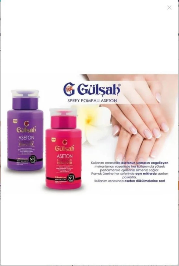 Ana Sayfa Kozmetik & Kişisel Bakım Kozmetik Makyaj Ürünleri Tırnaklar Aseton Gülşah Aseton Pompalı 175 ml