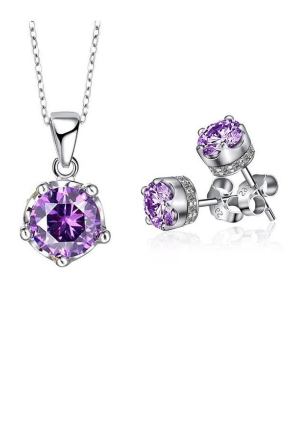 Gümüş Ametist Taşlı Taç Model Bayan Kolye Küpe Seti Gümüş Set