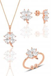 Gümüş rose zirkon taşlı yonca kolye küpe ve yüzük üçlü set