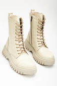 Hakiki Deri Kadın Bot Bej Parçalı Bağlı Kalın TabanRenk