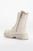 - Hakiki Deri Kadın Bot Bej Parçalı Bağlı Kalın Taban