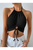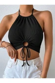 Halter Yaka Bağlamalı Büzgülü Siyah Renk Fitilli Crop Top Bluz