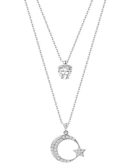Çift Zincirli Tek Taşlı Ay Yıldız Gümüş Beyaz Kolye GMS1914