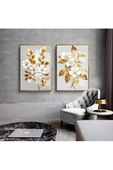 Harikabirev HARİKABİREV|BEYAZ-GOLD DESENLİ ÇİÇEK KOMBİNİ 01 |ÇERÇEVELİ CAM TABLO 2Lİ DİKEY