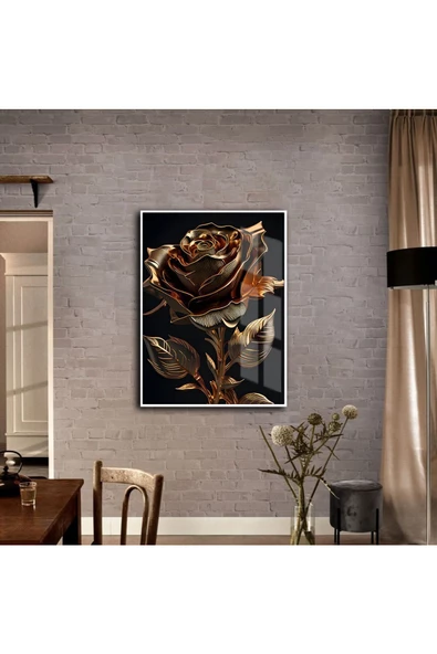 Harikabirev HARİKABİREV|ÇİÇEK TABLOSU SOYUT ÇİÇEK GOLD SİYAH 04|ÇERÇEVELİ TEMPERLİ CAM TABLO TEKLİ DİKEY
