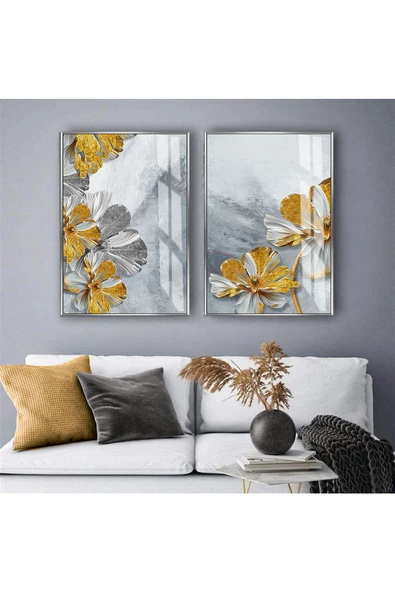 Harikabirev HARİKABİREV|GOLD-GRİ ÇİÇEK KOMBİNİ II |TEMPERLİ ÇERÇEVELİ CAM TABLO 2Lİ DİKEY
