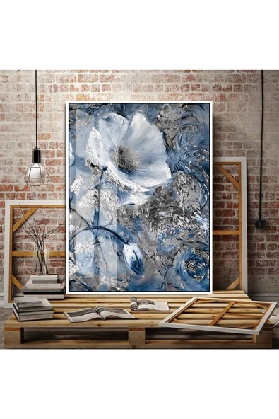 Harikabirev HARİKABİREV|LACİVERT-GÜMÜŞ ÇİÇEK TABLOSU 11 |ÇERÇEVELİ TEMPERLİ CAM TABLO TEKLİ DİKEY