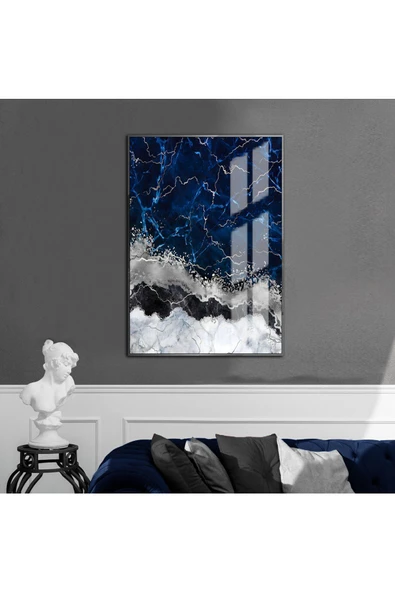 Harikabirev HARİKABİREV|MAVİ-GRİ-GÜMÜŞ KABARTMASIZ SOYUT MODEL 4 |ÇERÇEVELİ TEMPERLİ CAM TABLO TEKLİ DİKEY