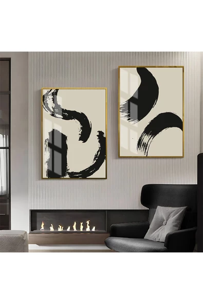 Harikabirev HARİKABİREV|SİYAH-BEJ DESENLİ SOYUT KOMBİNİ 1 |ÇERÇEVELİ CAM TABLO 2Lİ DİKEY