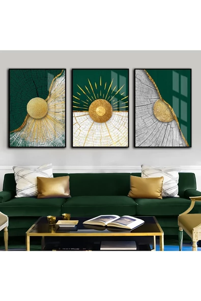 Harikabirev HARİKABİREV|ZÜMRÜT-GOLD KOMBİNİ SOYUT ŞEKİLLER KOMBİNİ |ÇERÇEVELİ TEMPERLİ CAM TABLO 3LÜ DİKEY