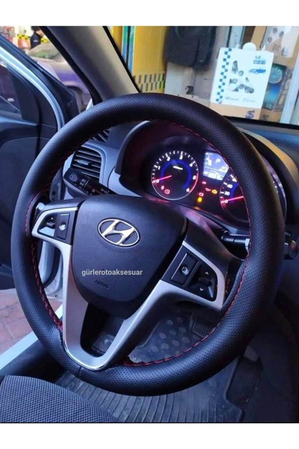 Hyundai I20 Deri Dikmeli Direksiyon Kılıfı Noktalı Kırmızı Ipli 10.5cm