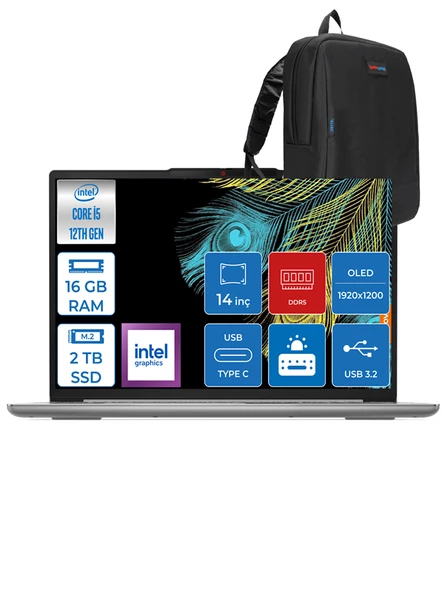 Ideapad 5 Slim Intel Core İ5-12450H 16GB Lpddr5 2tb SSD Windows 11 Home 14" 400NITS Wuxga OLED ID83BF0065TXH03 + Zettaçanta