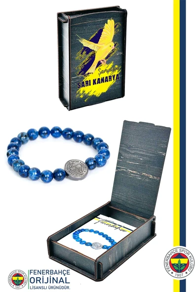 Fenerbahçe Orijinal Lisanslı Fb Lapis (8mm) Doğaltaş Bileklik Kanarya Baskılı Hediyelik Ahşap Kutulu