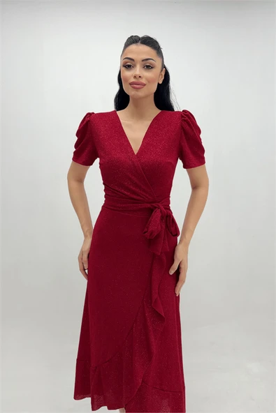 İthal Simli Kumaş Kuşak Detaylı Midiboy Elbise - KIRMIZI