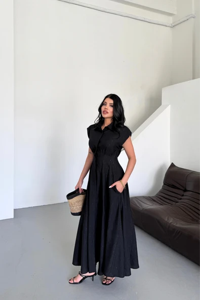 JAKARLI KETEN ELBİSE ÖNDEN YIRTMAÇLI CEPLİ - Siyah