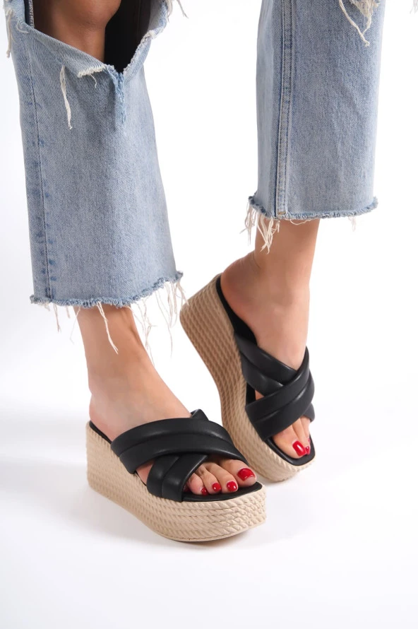 JOYMIX Dolgu Topuklu Ortopedik Taban Hasır Görünümlü Kadın Terlik KT Siyah
