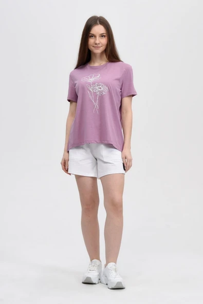 Kadın Baskılı Kısa Kollu Arka Oval Bisiklet Yaka Tişört Mor XL KAR MELANJ