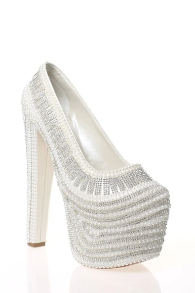 Kadın Beyaz Sedef İnci Taş İşlemeli Gelin Ayakkabı Kadın Topuklu Abiye Ayakkabı Şık Gece Ayakkabısı
