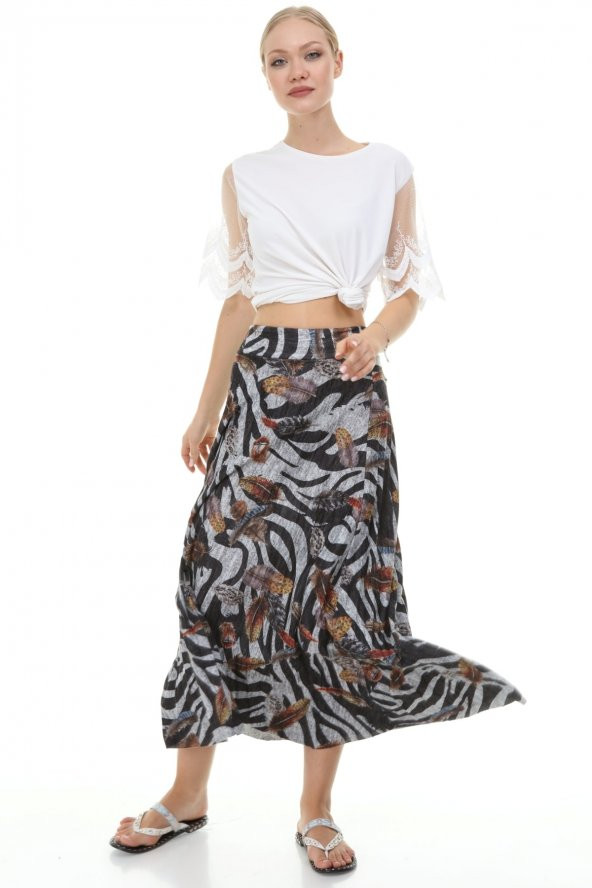 Kadın İthal İtalyan Siyah Tüy Baskılı Beli Lastikli Pliseli Uzun Etek 16276