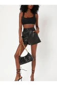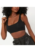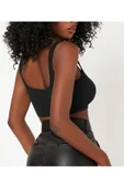 Kadın Kare Yaka Siyah Slim Fit Mini Crop Top Bluz