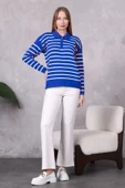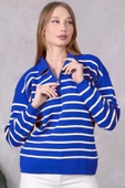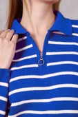 Kadın Polo Yaka Oversize Çizgili Fermuarlı Triko Kazak Saks MaviÜründe taksit avantajı var.
