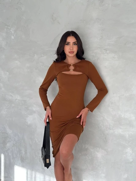 Kadın Uzun Kollu Halka Ve Pencere Dekolte Detay Fırsat ürün Midi Boy Elbise