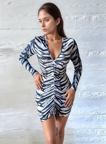Kadın V Yaka önü Asansör Büzgü Detay Fırsat ürün Zebra Mini Elbise