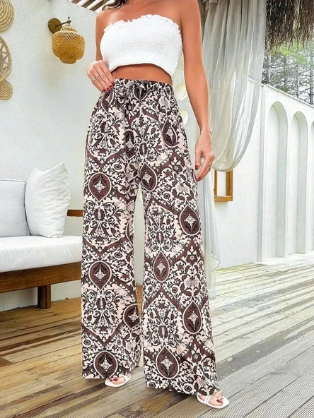 Kadın Yüksek Bel Etnik Desen Dokuma Viskon Salaş Pantolon