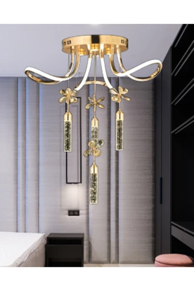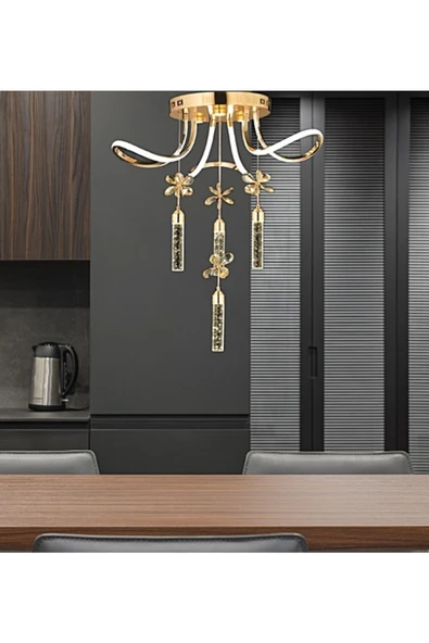 Fico Home Luxury Postmodern Kristal Taşlı Sarkıt Kelebek Taşlı Led Avize Gold Sarı