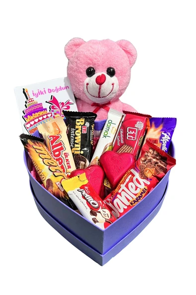 KibarGsmMarket Dogum Gunu Hediyesi Kız Arkadasa Pembe Ayıcık ve Mor Kalp Kutuda Çikolatalar