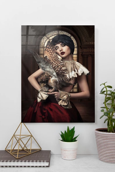 Kilisede Elinde Baykuş Tutan Güzel Kadın Cam Tablo | Hediyelik, Dekoratif, Ofis, Mutfak