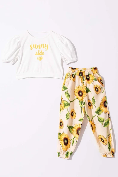 Kız Çocuk Ay Çiçeği Desenli Eşofman Altı ve Yazı Baskılı Beyaz Eşofman Takım