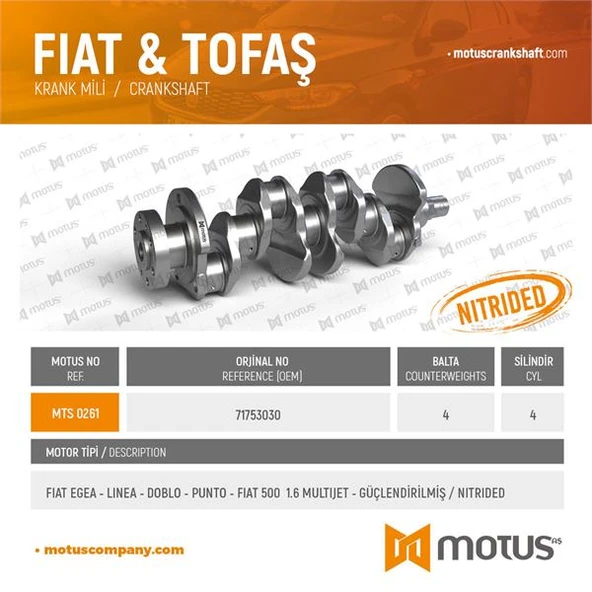 MOTUS markası Fiat Krank MILI Doblo Linea Egea 1,6 Multıjet - Motus 261 (MOTUS 261 kodlu) 71769903 ALFA 1126 OEM kodlarına sahip FIAT araçları için uyumlu olan bu ürün parcayuvasi.com'da uygun fiyatlarla, hızlı ve güvenli kargo ile hizmetinizdedir.