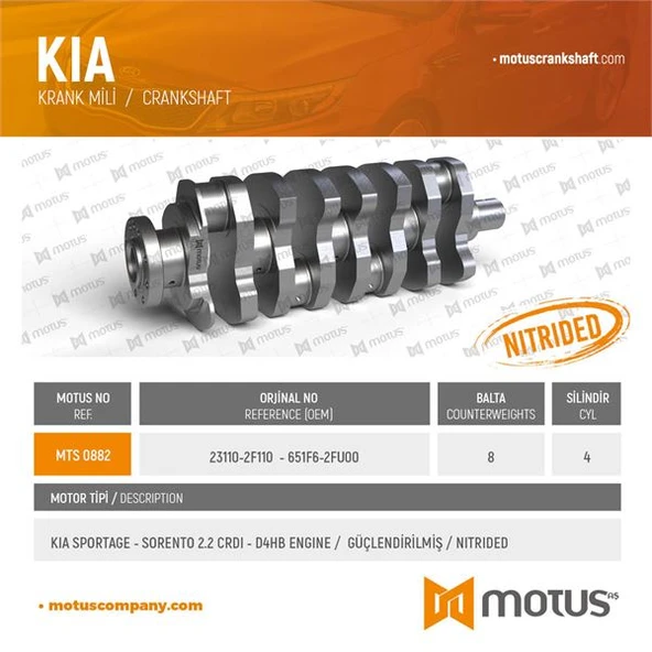 MOTUS markası Hyundaı Krank MILI Kia Sorento 2.2 Crdi 09>15 D4hb Guclendirilmis - Motus 882 (MOTUS 882 kodlu) 23110-2F110 651F6-2FU00 MOTUS 0882 OEM kodlarına sahip HYUNDAI araçları için uyumlu olan bu ürün parcayuvasi.com'da uygun fiyatlarla, hızlı ve güvenli kargo ile hizmetinizdedir.