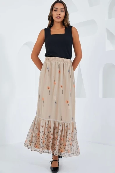 Krem Desenli Şifon Etek 8010