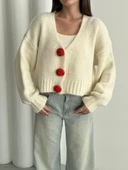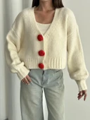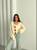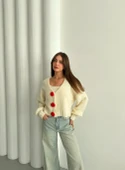 - Krem-Kırmızı Çiçek Düğmeli Hırka