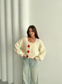 Krem-Kırmızı Çiçek Düğmeli Hırka