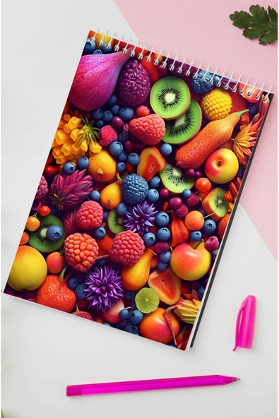 kutuTR Meyveler Desenli Ahşap Mdf Kapaklı 80 Yaprak Çizgili 14x21 Vip Bloknot 70gr/m2 Ç-OB07