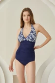 Lacivert Boyundan Bağlamalı Yaprak Desen Mayo