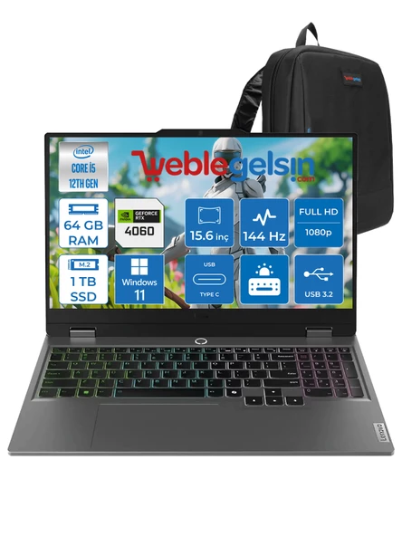 Lenovo loq 15IAX9 Intel I5 12450HX 64GB Ddr5 1tb SSD RTX4060 8gb (105W) 15.6″ Fhd Windows 11 Home 15.6" IPS Fhd 144HZ Taşınabilir Bilgisayar 883GS007XTRWH12 + Zettaçanta