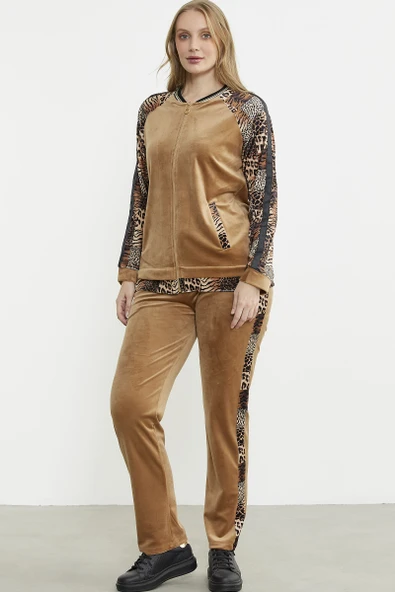 Leopar Kombinli Kadife Eşofman Takım - Bej