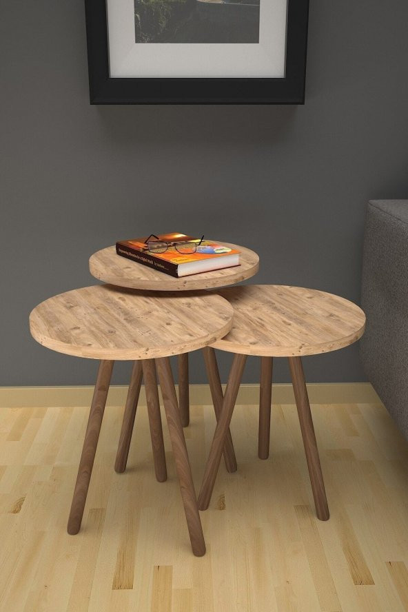 Limnizza 3lü Yuvarlak Zigon Sehpa Takımı Ahşap Ayaklı Modern Tarz Kahve ve Sunum Sehpası Atlantik çam